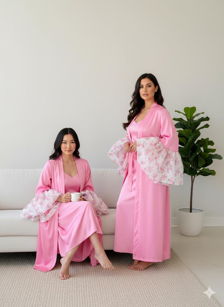 Our robes are crafted from a luxurious blend of cooling silk and lightweight organza for softness, breathability, and elegance.